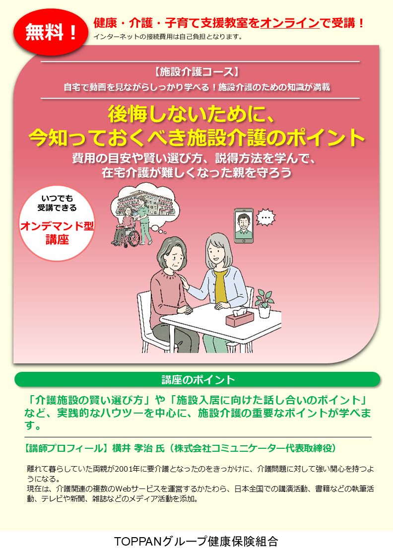 「介護施設の賢い選び方」や「施設入居に向けた話し合いのポイント」など、実践的なハウツーを中心に、施設介護の重要なポイントが学べます。