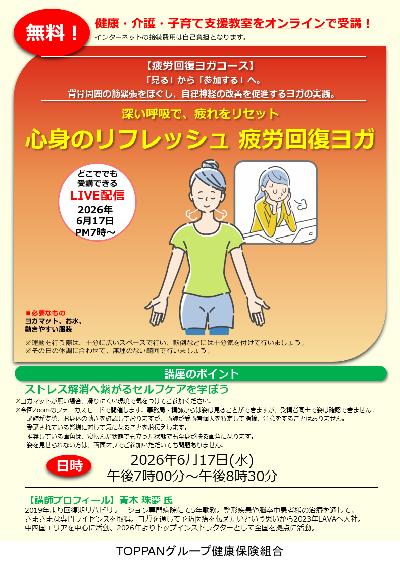 ※ヨガマットが無い場合、滑りにくい環境で気をつけてご参加ください。